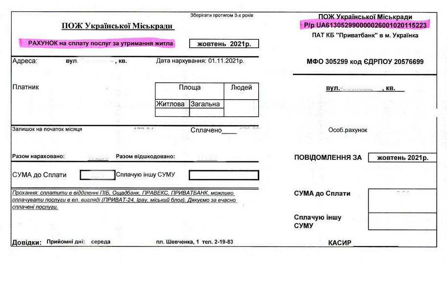 З 01.10.2021 змінилася назва послуги, яку ПОЖ надає населенню: з « утримання житла» - на «управління багатокваритирним будинком». А головне – змінився номер рахунку, на який надходять кошти від населення. Якщо у Вас є забаргованність на 01.10.2021 року – Ви отримуєте дві квитанції. У першій квитанції вказан Ваш борг станом на 01.10.2021, який Ви повинні сплатить. А у другій квитанції - поточні нарахування.