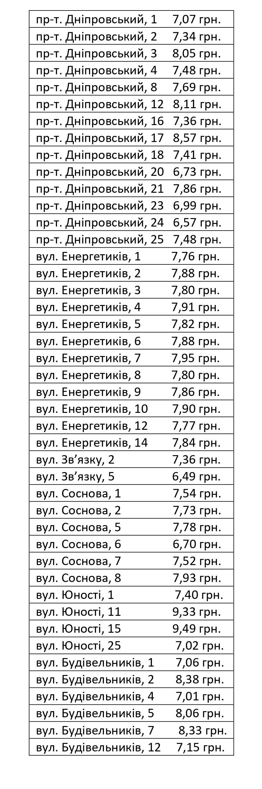 У кожного будинку свій тариф, з яким Ви можете ознайомитись у таблиці.