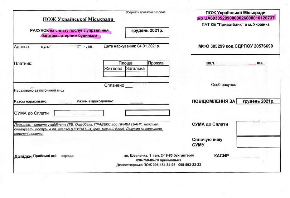 З 01.10.2021 змінилася назва послуги, яку ПОЖ надає населенню: з « утримання житла» - на «управління багатокваритирним будинком». А головне – змінився номер рахунку, на який надходять кошти від населення. Якщо у Вас є забаргованність на 01.10.2021 року – Ви отримуєте дві квитанції. У першій квитанції вказан Ваш борг станом на 01.10.2021, який Ви повинні сплатить. А у другій квитанції - поточні нарахування.